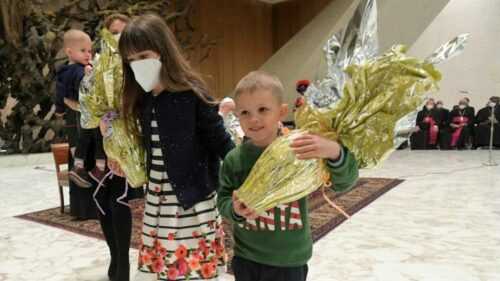 Sul palco lo raggiungono alcuni bambini ucraini, accompagnati dai genitori. Il più piccolo è in braccio alla mamma, il più grande porta un disegno con delle mani bianche sopra i colori della bandiera ucraina e un cuore vicino la bandiera dell’Italia che li ha accolti. “Salutiamoli e preghiamo insieme con loro”, esorta Papa Francesco. E commenta: