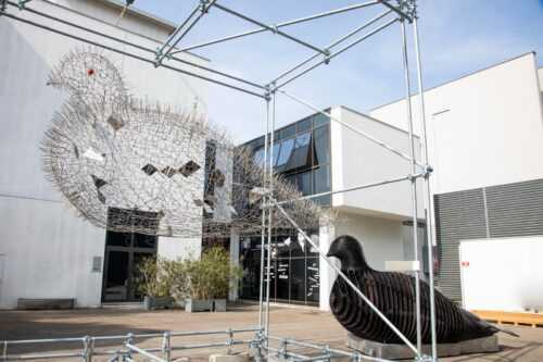 Cuore pulsante della mostra è il Dissuader collocato all’esterno nella Piazza dell’Arte, un monumentale piccione metallico trafitto da punte e sospeso in aria, simbolo potente delle barriere invisibili che disciplinano le nostre città. A dialogare con esso, la sua controparte in legno lamellare, adagiata a terra. In un cielo ormai saturo di droni e satelliti, l’opera di Perrotti ci invita a riflettere, trasformando il progetto tecnico in una responsabilità etica condivisa.