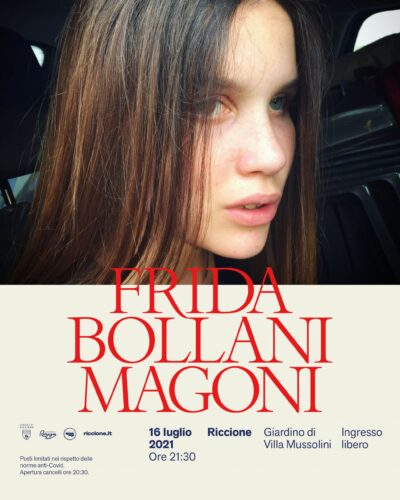 Riccione – La Città di Riccione inaugura sotto la luna di luglio la tre giorni della Festa della Madonna del Mare (16-17-18 luglio 2021) con il concerto dell’astro nascente della musica italiana, la giovanissima e prodigiosa pianista, polistrumentista e cantante Frida Bollani Magoni che si esibirà in uno dei suoi primissimi concerti. Venerdì 16 luglio, alle ore 21:30, l’ artista accompagnerà il pubblico con il suo pianoforte in un viaggio indimenticabile fatto di sonorità, incanto, voce, così potente nella sua delicatezza, così dolce nella sua interpretazione artistica. Frida, talento raro, reduce dall’emozionante esibizione al Quirinale di fronte al Presidente della Repubblica in occasione delle celebrazioni del 2 giugno, è stata anche ospite speciale della fortunata trasmissione televisiva Rai Via dei Matti numero 0, condotta dal padre, il compositore Stefano Bollani, e dall’attrice riccionese Valentina Cenni. La location scelta per questo attesissimo live riccionese è la Villa Mussolini, un vero e proprio terrazzo sull’ Adriatico, spazio artistico, sede di mostre temporanee, uno dei luoghi più belli e incantevoli della riviera, a pochi passi da viale Ceccarini e dal mare. Al termine del concerto sarà possibile visitare la mostra “Cabine! Cabine! Istantanee di vita adriatica dopo l’ apocalittica nottata. Fotografie dall’ album dei ricordi dei bagnini riccionesi”, realizzata da Riccione Teatro in collaborazione con Associazione per la candidatura Unesco sede di Riccione.