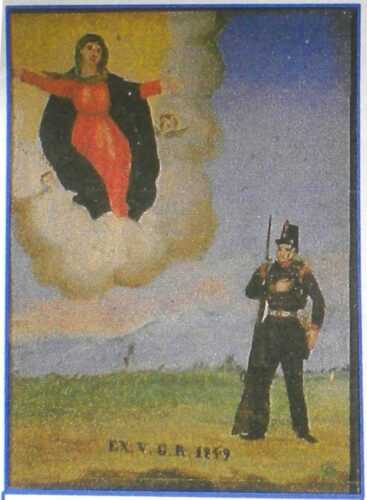 Nella foto: una tavoletta ex-voto di Forno Alpi Graie, che ricorda il ritorno a casa del capo famiglia, sano e salvo, dopo la Guerra d’Indipendenza del 1859.