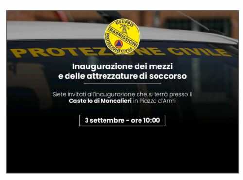 Nel prestigioso Castello di Moncalieri in Piazza D’Armi il 3 settembre 2022 alle ore 10:00 avrà luogo l’inaugurazione dei mezzi e delle nuove attrezzature di soccorso del Gruppo Trasmissione Protezione Civile presieduto dalla presidente sig.ra Anna De Luca che in molti anni ha saputo dimostrare la forza e la validità del volontariato organizzato con volontari addestrati pronti a partire in poche ore dall’evento