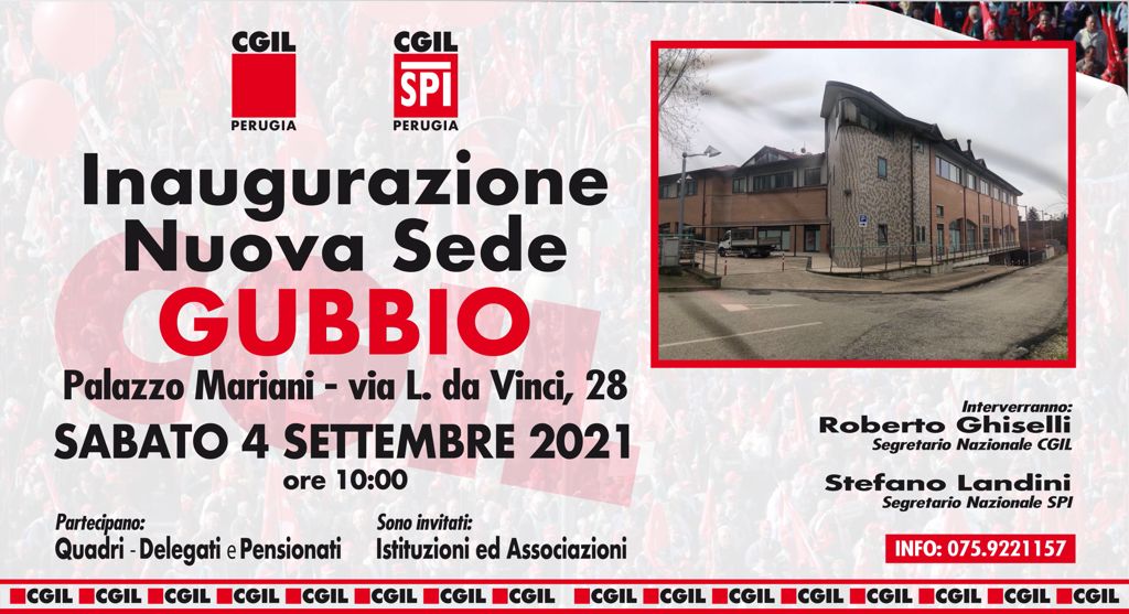 Sabato 4 settembre 2021, alle ore 10,00, verrà inaugurata la nuova sede della Camera del Lavoro di Gubbio, situata in via Leonardo da Vinci 28.
