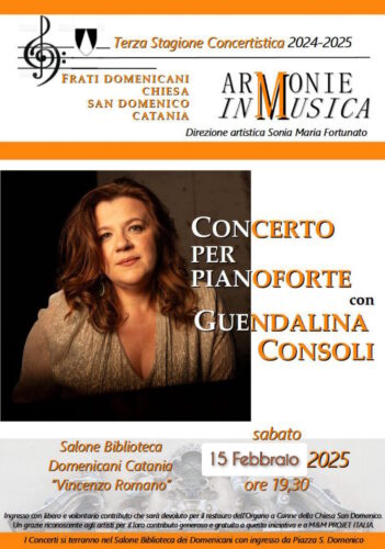 Sabato 15 febbraio 2025 alle ore 19:30, Guendalina Consoli si esibirà presso la Chiesa di San Domenico di Catania, nel suggestivo Salone Biblioteca “Vincenzo Romano”