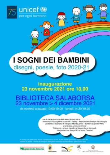 In SalaBorsa è possibile ammirare, fino al 4 dicembre 2021, alcuni dei disegni pubblicati nel libro “I bambini al tempo del lockdown” edito da Pendragon che nasce da un’idea del Comitato UNICEF di Bologna con la partecipazione degli alunni delle scuole della provincia. Saranno esposti i lavori realizzati dai bambini ricoverati negli Ospedali di Bologna, i disegni sui diritti dell’infanzia e dell’adolescenza secondo la Convenzione ONU; nella galleria troverà posto una raccolta di immagini e volti di bambini durante la pandemia a cura del fotografo Massimiliano Martorelli, una selezione di scatti tra strade, piazze e monumenti di Bologna durante il lockdown realizzate da Luciano Nadalini fotografo e un’interpretazione dei disegni in mostra a cura di Anna Maria Casadei. Alla mostra parteciperà anche l’Istituto – “amico” delle iniziative Unicef – Gaetano Salvemini di Casalecchio di Reno attraverso i quadri sulla strage del 1990.