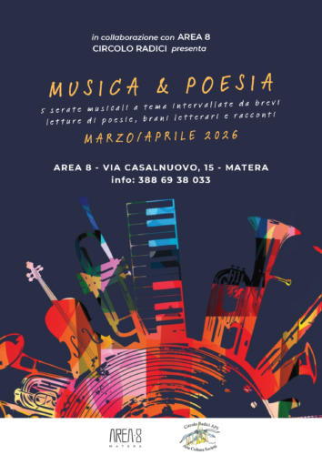 Si terrà il prossimo 30 aprile alle 21:00 ad Area8* in via Casalnuovo 15 a Matera il quinto ed ultimo concerto della rassegna Musica & Poesia, cinque serate musicali a tema, intervallate da brevi letture di poesie, brani letterari e racconti, curata dal Circolo Radici APS.
