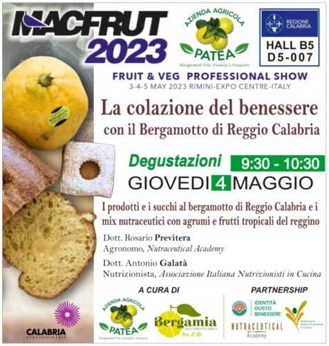 E’ importante esaltare e far crescere il sistema prodotto-territorio, esaltando le peculiarità nutraceutiche e salutistiche del principe degli agrumi”. E infatti al MACFRUT di Rimini la mattina di giovedì 4 maggio presso lo stand collettivo regionale, verrà presentata e offerta a cura dall’Azienda agricola Patea e dalla coop Bergamia “La colazione del benessere con il bergamotto di Reggio Calabria”. Dalle 9,30 alle 10,30 oltre a poter degustare si potrà partecipare al talk-colazione “I prodotti e i succhi al Bergamotto di Reggio Calabria e i mix nutraceutici con agrumi e frutti tropicali del reggino” con gli esperti del settore tra i quali l’agronomo Rosario Previtera di Nutraceutical Academy, il nutrizionista Antonio Galatà presidente dell’Associazione Italiana Nutrizionisti in Cucina, la gastronoma Anna Aloi di Identità Gusto e Benessere.