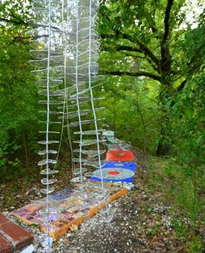 Formato da piani in cemento leggero, poggiati su un precedente tratturo, larghi 1 metro e lunghi due metri, ognuno lavorato, dipinto, istoriato, mosaicato da un artista diverso, la camminata, sta andando a formare una vera e propria “street art” che si completerà in un anello nel bosco.