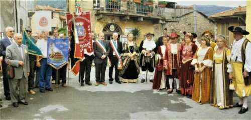 La foto, con al centro i sindaci Pagliarani e Lajolo attorniati dai figuranti in costumi d’epoca, è una cortese concessione dall’archivio della Pro-Loco