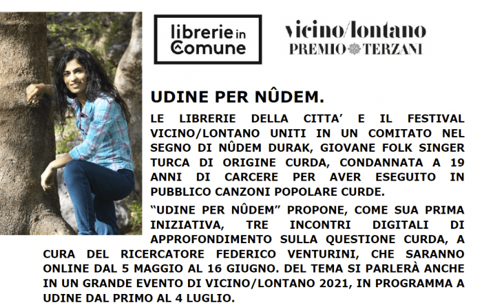 Il terzo appuntamento – mercoledì 16 giugno, sempre alle 20.45 – sarà incentrato sull’importante ruolo della donna nella progettualità curda. Questa volta Federico Venturini sarà in dialogo con Fabiana Cioni, architetto, dottoranda IUAV, fotografa e docente, attivista di Rete Jin e Jineoloji. Il ciclo di incontri in libreria avrà poi un seguito nell’ambito del festival vicino/lontano, che alla questione curda dedicherà uno degli eventi principali della sua 17esima edizione, in calendario – in presenza – dal 1° al 4 luglio. Già lo scorso settembre vicino/lontano aveva ospitato un evento scenico dedicato al caso di Nûdem Durak, per la regia di Manuel Marrese, con l’intervento, tra gli altri, della musicista Bruna Perraro oltre che dello stesso Federico Venturini, tutti e tre parti attive e propositive del neonato comitato udinese.