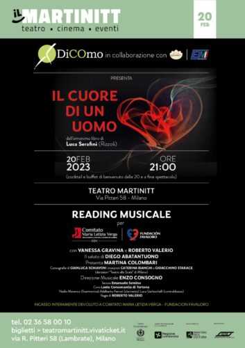 Milano – Il Teatro Martinitt di via Pitteri, lunedì 20 febbraio alle 21.00, ospiterà il reading musicale “Il cuore di un uomo” tratto dall’omonimo libro del giornalista e scrittore Luca Serafini, amico di vecchia data del Comitato Verga e organizzatore dell’evento. È un’idea dell’autore, infatti, lo spettacolo charity a favore del Comitato Maria Letizia Verga, che da più di quarant’anni si impegna nella cura, nella ricerca e nell’assistenza dei bambini e ragazzi affetti da leucemia e linfomi e della Fundacíon Favaloro, ospedale universitario fondato dal padre del bypass coronarico René Gerónimo Favaloro alla vita del quale è ispirata l’intera opera.