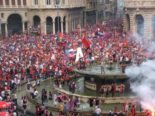 La città è scesa in strada al fischio finale, anche se sin dalle prime ore di oggi aveva cominciato a festeggiare. Piazza De Ferrari, che qualche giorno fa aveva visto il raduno dei tifosi del Napoli festeggiare lo scudetto è stata nuovamente popolata di tifosi di calcio. Questa volta rossoblù.