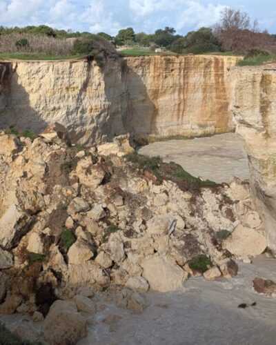 Il crollo sarebbe stato causato dalle mareggiate e dalle piogge violente di questi giorni, l’ultima nel corso della scorsa serata. Si tratta del danno più importante causato dall’erosione costiera al paesaggio del Salento.