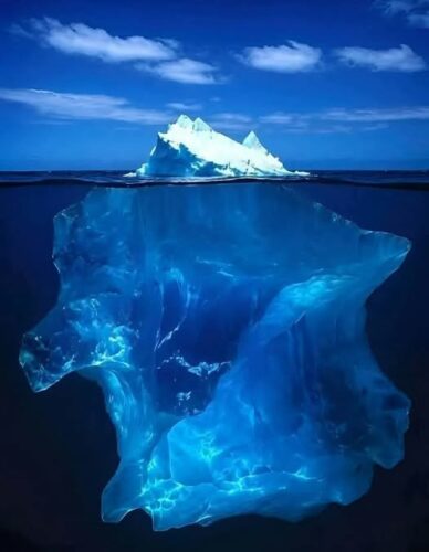 Un iceberg è un’enorme massa di ghiaccio dolce che si stacca da ghiacciai più grandi e inizia a galleggiare nelle acque dell’oceano. Solo circa un ottavo della sua struttura è visibile in superficie, mentre il resto rimane nascosto sotto il livello del mare.