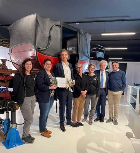 Il Presidente del Museo Nazionale dell’Automobile Benedetto Camerana, il Direttore Lorenza Bravetta e il Responsabile del Centro di Conservazione e Restauro Davide Lorenzone ricevono – a nome dell’intero staff museale – lo speciale riconoscimento della Commissione Cultura di FIVA – Fédération Internationale des Véhicules Anciens “per l’eccezionale e rigoroso lavoro di ricerca e restauro svolti sul progetto della Carrozza a Vapore Virginio Bordino“.