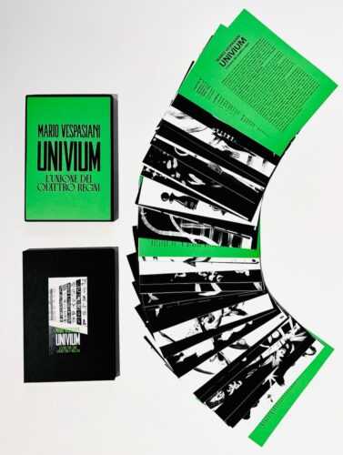 La grande originalità di Mario Vespasiani sta nella sua capacità di attraversare linguaggi e forme senza mai perdere di coerenza. Dalla pittura alla fotografia, dalla letteratura alla musica è un osservatore instancabile del reale e delle sue stratificazioni simboliche, mediante una ricerca che si muove con naturalezza tra immagine, pensiero e sperimentazione. La sua versatilità – riuscendo ad evitare la dispersione – può leggersi come estensione interdisciplinare: ogni progetto difatti, diventa un nuovo modo per interrogare il mondo e le sue connessioni profonde. In questo percorso si inserisce anche la sua dimensione di “inventore”, già emersa con AbeceMario e confermata con Univium –L’unione dei quattro Regni, il suo secondo gioco formativo che, attraverso le carte-opere, traduce la sua poetica in esperienza diretta.