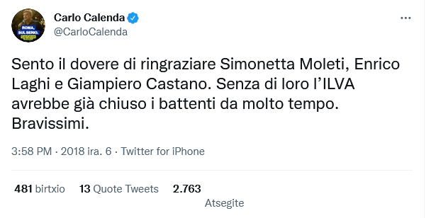 Così come spicca il tweet scritto nel 2018 dall’ex Ministro e candidato a sindaco di Roma, Carlo Calenda, che volle fortemente Enrico Laghi come commissario Alitalia e che in merito al caso Ilva scrisse “Sento il dovere di ringraziare Simonetta Moleti, Enrico Laghi e Giampiero Castano. Senza di loro l’Ilva avrebbe già chiuso i battenti da molto tempo. Bravissimi”.