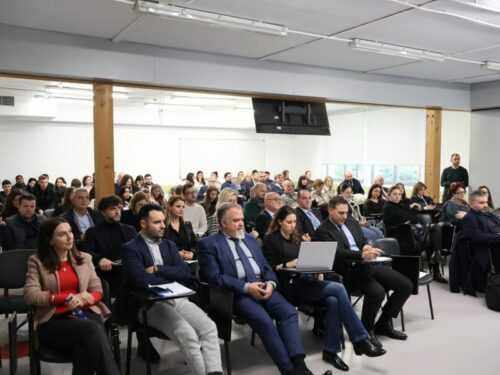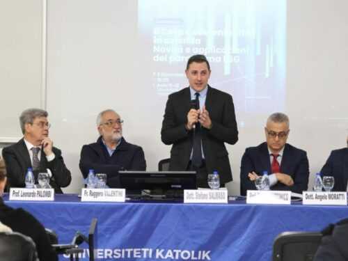 A inizio settimana, il Direttore generale Alessandro D’Oria (nella foto di apertura) è stato relatore presso l’Università cattolica della “Nostra Signora del Buon Consiglio” nel contesto di un convegno molto interattivo dal titolo “B Corp e sostenibilità in impresa: innovazioni e applicazioni del paradigma ESG”, con la partecipazione di esperti di vari settori che hanno condiviso intuizioni e strategie per affrontare le sfide e le opportunità della gestione sostenibile per fare fronte ai costi derivanti dal cambiamento climatico, dalle pandemie e dai conflitti globali. Nel corso dell’illustre sezione di dibattito, il dr D’Oria, Amministratore delegato di Intesa Sanpaolo Bank Albania, ha sottolineato l’importanza di modelli di business sostenibili e il ruolo dei principi ESG (Environmental, Social, Governance) per un cambiamento positivo: “È consolidato l’impegno del Gruppo Intesa Sanpaolo a promuovere iniziative che garantiscano la sostenibilità economica e ambientale nel lungo periodo. Questa conferenza è una testimonianza del potere della collaborazione tra il mondo accademico e l’industria nel promuovere il benessere collettivo e la sostenibilità con il coinvolgimento di tutti i soggetti del Sistema Italia”.