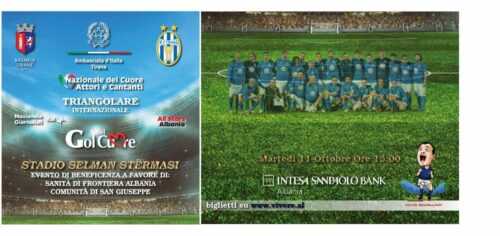 Alle ore 15 dell’11 ottobre, allo stadio Selman Stermasi di Tirana, sarà celebrato uno speciale torneo triangolare tra la nostra Nazionale del cuore Attori & Cantanti, la Nazionale Giornalisti Rai e la squadra All Stars Albania, per uno straordinario evento di beneficenza promosso dalla nostra Ambasciata assieme all’Amministrazione comunale della Capitale albanese e alla società calcistica Klub Futbollit KF Tirana, con il sostegno di Intesa Sanpaolo Bank (Gruppo Intesa)