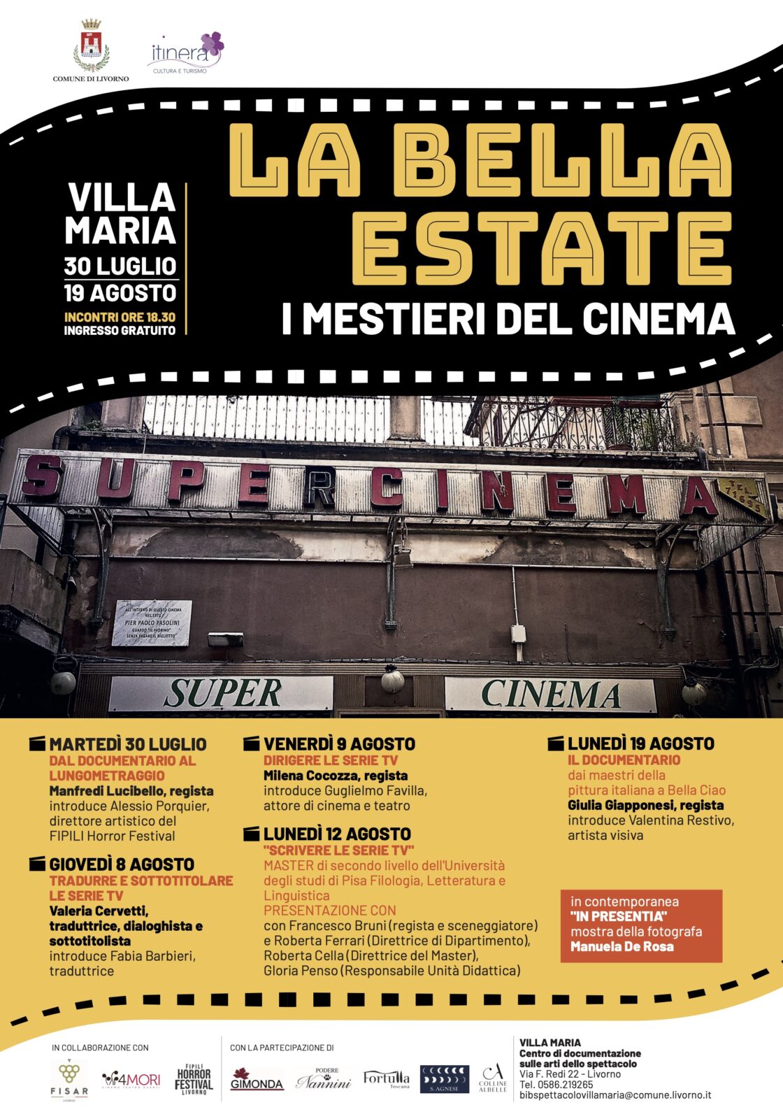 Promossa dal Comune di Livorno e realizzata dalla Cooperativa Itinera in collaborazione con Fisar Livorno, Cinema Teatro 4 Mori e FIPILI Horror Festival, la rassegna vedrà, come ogni anno, la partecipazione di alcune cantine del territorio – Gimonda, Fortulla, Podere Nannini, Sant’Agnese Farm e Colline Albelle – che offriranno, al termine degli incontri, la degustazione dei vini prodotti.