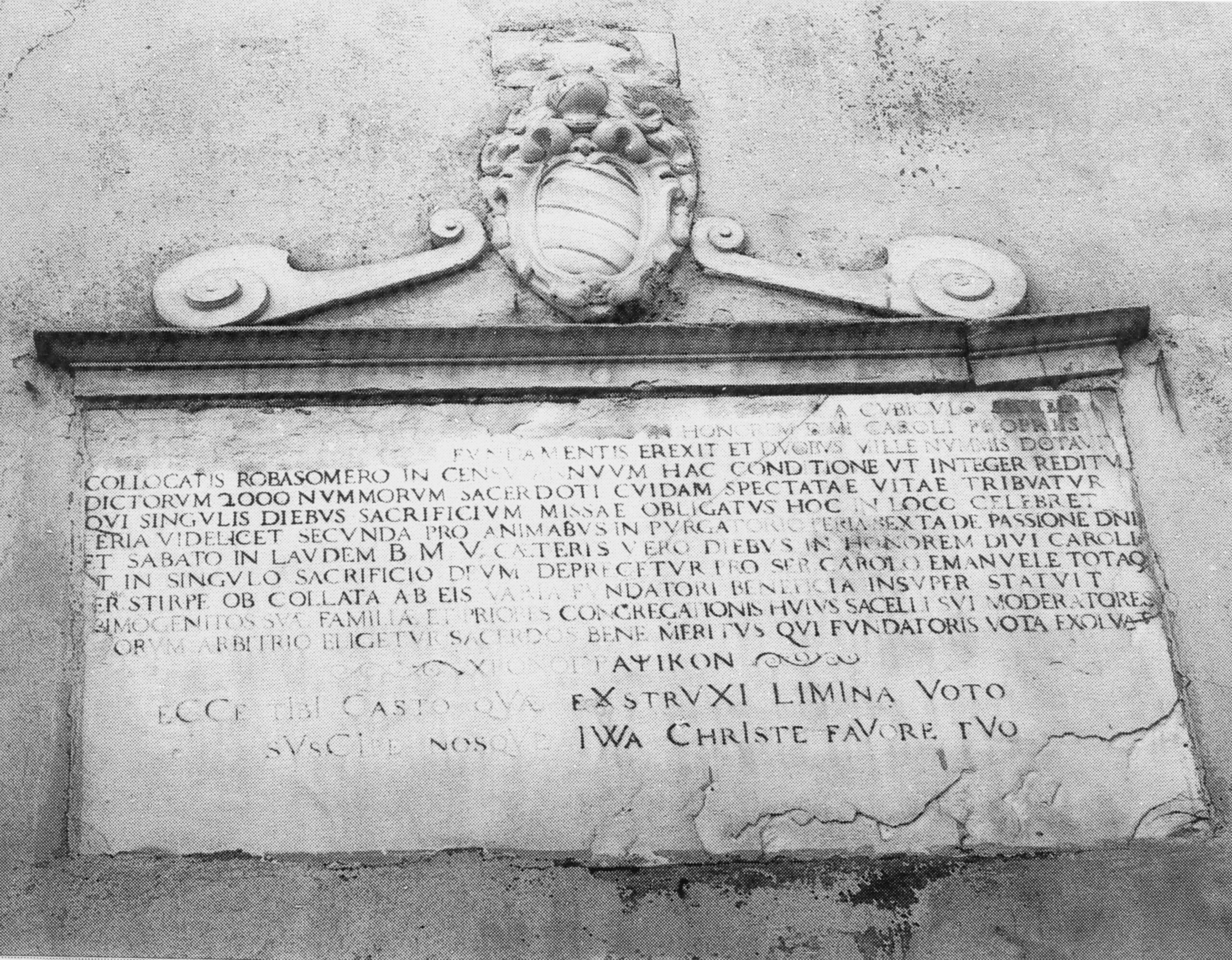 Cominciamo dalla lapide in marmo sulla porta d’ingresso: l’incisione, un distico votivo di enigmatica comprensione, è stata liberamente tradotta e interpretata per la prima volta dallo scrivente e citata nel libro di Marisa e Manuel Torello su Robassomero. La prima parte risulta scalpellata, per poi proseguire: “Da una celletta (cubicolo, sacello)… qui… eresse proprie… fondamenta questo tempietto in onore di San Carlo e lo dotò di 2000 (monete) devolute a Robassomero in una rendita annua alla condizione che l’intero reddito delle suddette 2000 (monete) venga assegnato ad un sacerdote dalla vita virtuosa che obbligatoriamente celebri messa in questo luogo ogni giorno, cioè il lunedì per le anime del purgatorio, il venerdì giorno della passione di Dio e il sabato in lode della Vergine Maria, negli altri giorni in onore di San Carlo. E in ogni messa preghi Dio per il Serenissimo Carlo Emanuele e per tutta la Serenissima Stirpe per tutti i benefici concessi da loro al fondatore. Ed inoltre stabilì come rettori di questo tempietto i primogeniti della sua famiglia e i Priori della Congregazione: a loro arbitrio sarà scelto il sacerdote benemerito che assolva i voti del fondatore. Cronografico ecco ricevi l’edificio che ti ho costruito con sacro voto e donaci la tua benedizione o Cristo”.