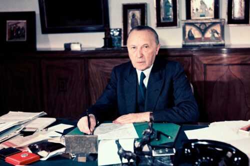 Konrad Hermann Joseph Adenauer (Colonia, 5 gennaio 1876 – Bad Honnef, 19 aprile 1967) è stato un politico e statista tedesco e uno dei padri fondatori della Comunità europea, insieme ai francesi Robert Schuman e Jean Monnet e all’italiano Alcide De Gasperi. Cancelliere della Germania Ovest dal 1949 al 1963 e leader dell’Unione Cristiano-Democratica (CDU) dal 1950 al 1966, la sua carriera politica è durata circa 60 anni.