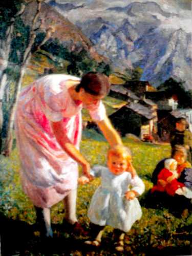 Osservate il grande quadro qui riportato, “I primi passi”, del 1923: descrizione di una vita famigliare vissuta a contatto con la natura e nella pace dei campi, tra gente semplice, abiti semplici e la ricchezza e l’incanto del paesaggio, con una nonna che accudisce un bimbo ancora in fasce e cuffietta ed in primo piano una mamma con il suo ampio e leggero vestito a sacco – probabilmente accaldata, pur con lo sfondo delle grandi montagne delle Alpi Graie – che, china su di lei, fa muovere “i primi passi” ad un’altra bimba (così pare) guidandola con le braccia con attenzione, cura ed amore, tra baite in pietra viva ed un piccolo bosco verde sullo sfondo.