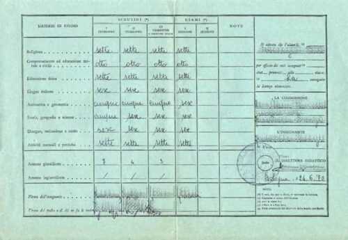 Un cinque, a gamba tesa. Qualche sette in ordine sparso. Il nove in italiano, perenne ancora di salvezza. Comportamento, attività manuali e pratiche di cui nessuno ha mai capito il senso, matematica e geometria, storia, geografia e scienze, l’odiato disegno, educazione fisica.