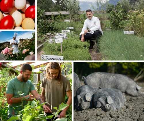 Appassionato di verdure ormai dimenticate e puntiglioso nell’assicurarsi che il percorso di frutta e ortaggi dal luogo di coltivazione sia il più breve possibile, lo chef può contare su un allevamento di 85 mucche da latte che vivono pacifiche nella stalla “compost” sostenibile e di ultima generazione dei masi dell’hotel.