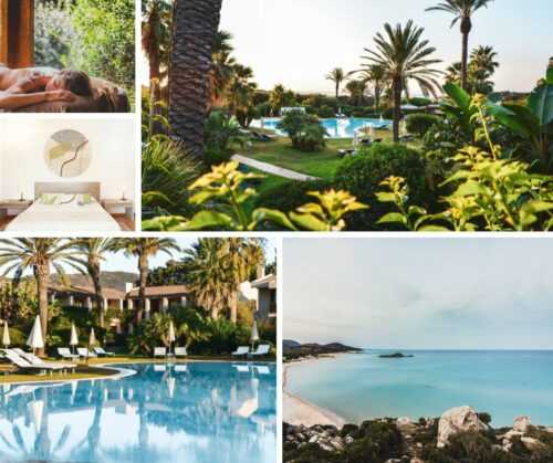 Su Giudeu, in località Spartivento a Chia – a circa 40 minuti da Cagliari – regala acque cristalline dalle sfumature color smeraldo, alte dune di sabbia a lambire la macchia mediterranea e lo spettacolo unico dei fenicotteri rosa da accarezzare con lo sguardo mentre si percorre – a piedi nudi – la passerella di legno che collega l’hotel alla spiaggia.