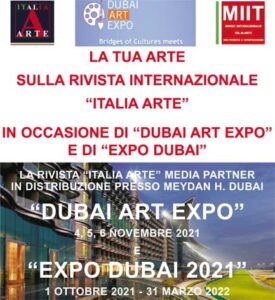 La rivista Italia Arte, infatti, in quelle occasioni sarà in distribuzione con un numero speciale, parallelamente alla mostra di Arte Contemporanea e dell’Evento Ippico, all’Expo Internazionale di Dubai; ed anche oltre, fino al 31 marzo 2022, per promuovere e presentare i migliori artisti italiani e internazionali.