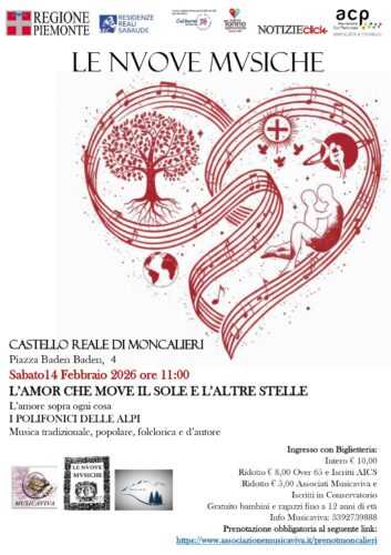 Per dirla con il sommo poeta: “L’amor che move il mondo e l’altre stelle” illuminerà la mattinata prima del pasto principale, questo amore anch’esso proposto – nell’ambito di Le Nvove Mvsiche Festival – in quattro momenti tematici, alle 11 di sabato 14 febbraio nella Sala Letizia del Real Castello di Moncalieri (ingresso da Piazza Baden Baden, 4), con musica che spazia dall’antico al tradizionale, attraverso il popolare, il folclorico e brani d’autore approfondendo tutte le sfumature dell’animo umano.