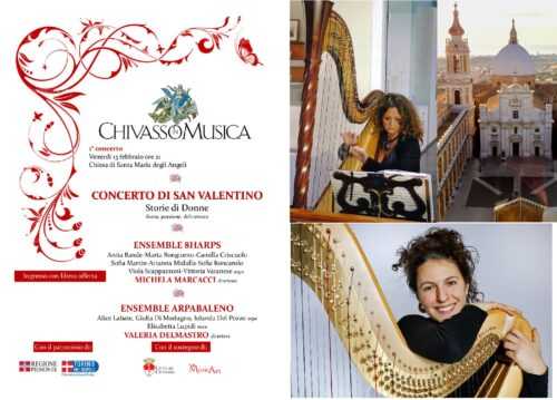 CHIVASSO (TO) – La stagione Chivasso in Musica 2026 – che sarà costituita da cinque concerti programmati dal 13 febbraio al 26 settembre – si aprirà quest’anno con il Concerto di San Valentino che avrà luogo il venerdì 13 febbraio alle 21 nella accogliente Chiesa di Santa Maria degli Angeli. Con il marchio MusicArt 2026 e con il sostegno del Comune di Chivasso (GianLuca Vitale, assessore alla Cultura), sarà proposto un concerto tutto al femminile con la partecipazione di due prestigiose “ensemble” d’arpe sul tema dell’amore e della celebrazione delle emozioni umane.