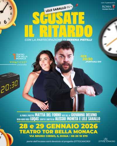 Uno spettacolo che mescola sketch esilaranti, momenti musicali e interazioni coinvolgenti con il pubblico: questo è Scusate il Ritardo, che il 28 e 29 gennaio 2026 farà tappa al Teatro Tor Bella Monaca (via Bruno Cirino 5, Roma – ore 20.30, ingresso: intero 20€, ridotto 15€). Dopo i sold out dei precedenti appuntamenti, Lele Sarallo torna a portare sul palco un’esperienza teatrale che rompe ogni confine tra comedy tradizionale e intrattenimento contemporaneo.