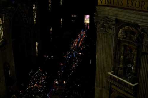 Infigge poi nel cero in forma di croce cinque grani di incenso. La luce del Cristo che risorge glorioso disperda le tenebre del cuore e dello spirito: è l’invocazione che si intreccia, nell’intimo dei fedeli, con gli echi dei conflitti e delle violenze che bruciano il mondo. Con il Pontefice, uno stuolo di cardinali, vescovi, sacerdoti procedono in silenzio verso l’altare della Confessione, ciascuno con una candela in mano; il tempio cristiano si illumina a giorno alla terza acclamazione, da parte del diacono, di Lumen Christi.