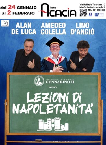 Torna in scena “Lezioni di Napoletanità“, lo spettacolo comico di Alan De Luca, Amedeo Colella e Lino D’Angiò. Dal 24 gennaio al 2 febbraio 2025 il Teatro Acacia (via Raffaele Tarantino, 10 – Napoli) ospita 6 repliche della nuova versione dello spettacolo prodotto da MusicaèManagement di Giovanni Oliviero. Una sorta di congresso internazionale di cultura napoletana, di napoletanità, ovvero il modo di essere, di pensare e di comportarsi del popolo partenopeo.