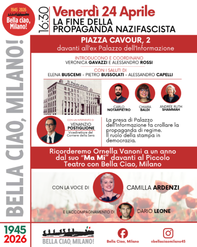 Milano – Venerdì 24 aprile alle ore 16:30 torna “Bella ciao, Milano!” con un appuntamento pubblico in Piazza Cavour 2, davanti al Palazzo dell’Informazione.