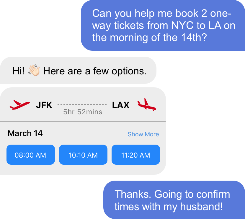 Le compagnie aeree e gli agenti, grazie al conversational commerce, hanno la possibilità di vendere biglietti e aiutare i viaggiatori con le operazioni di prenotazione che si effettuano direttamente nei canali di messaggistica che già utilizzano quotidianamente.