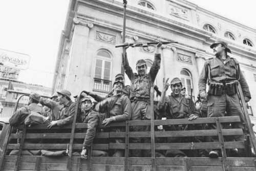 La mostra Lisbona, la notte è finita! testimonia e documenta gli avvenimenti del 25 aprile 1974 e dei giorni seguenti fino alla storica manifestazione del 1° maggio 1974 a Lisbona, così detta Rivoluzione dei Garofani. Infatti il 25 aprile un colpo di stato incruento pose fine, in Portogallo, al più duraturo regime dittatoriale dell’Europa occidentale: un avvenimento straordinario che ben presto assunse caratteri rivoluzionari, entrando nell’immaginario collettivo, non solo portoghese, come uno degli episodi più entusiasmanti e commoventi della lotta per la libertà e la giustizia nel XX secolo.