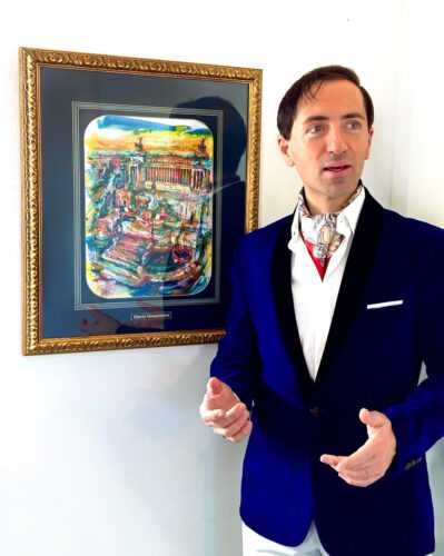Al Capo dello Stato è stato fatto dono di un pregevole dipinto di Mario Vespasiani, giovane maestro che si è sempre distinto per le sue qualità artistiche e umane, per l’attaccamento a quei valori fondamentali di identità e di unità. L’opera raffigura la veduta aerea dell’Altare della Patria, un monumento caro all’artista in quanto durante il bombardamento di San Lorenzo, il nonno di cui porta il nome, era proprio di guardia al Milite Ignoto. Il dipinto riassume tutta l’estetica di Vespasiani, che in quelle pennellate vibranti ha saputo far risuonare passione e sentimento, energia e partecipazione. Ma sono i colori, quel virtuoso abbinamento cromatico a rendere le opere dell’artista inconfondibili e questa sua abilità non è sfuggita al Presidente della Repubblica che ha dichiarato di fronte al dipinto di Vespasiani: “straordinario l’uso dei colori”.