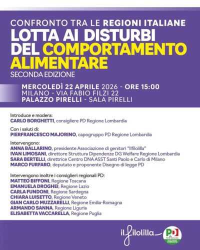 A partire dalle 15, in sala Pirelli, al Palazzo Pirelli, in via F. Filzi 22, a Milano, si terrà la seconda edizione dell’incontro “Lotta ai disturbi del comportamento alimentare – Confronto tra le regioni italiane“, organizzato dal Gruppo regionale del Pd.