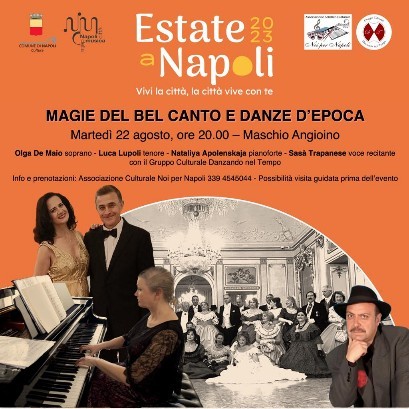 Magie del Belcanto e Danze d’Epoca 22 agosto 2023 h.20:00 Maschio Angioino Napoli Sarà un affascinante viaggio nel mondo del Belcanto e delle Danze d’Epoca in collaborazione con il Gruppo Culturale ” Danzando nel Tempo” dal titolo , MAGIE DEL BELCANTO E DANZE D’ EPOCA