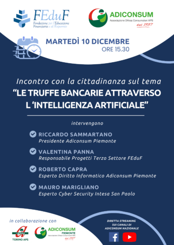 Ma come difendersi? Scopritelo seguendo l’incontro con la cittadinanza promosso da Adiconsum nazionale e FEduF (Fondazione per l’Educazione Finanziaria e al Risparmio) e realizzato in collaborazione con Adiconsum Piemonte e Anteas Piemonte.