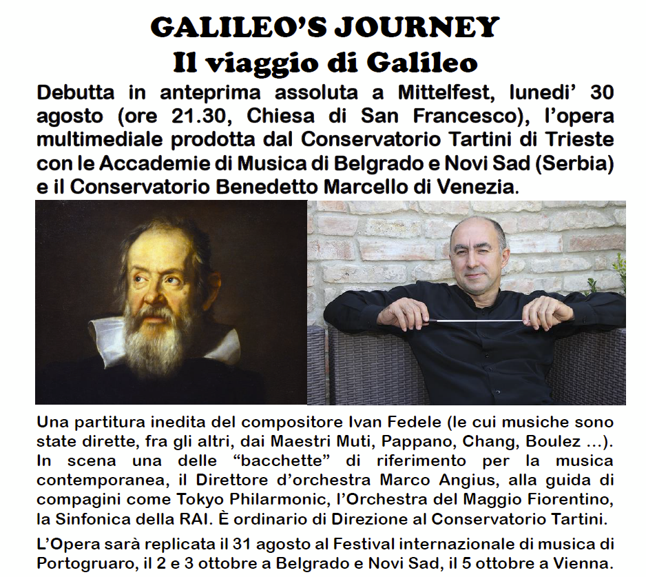 TRIESTE – Un omaggio a Galileo Galilei e insieme alla cultura scientifica, una proiezione sonora nelle suggestioni del cosmo ma anche nelle visioni dell’astronomia, che ne indaga le leggi: “Galileo’s journey. Il viaggio di Galileo” titola l’opera multimediale prodotta dal Conservatorio Tartini di Trieste, in partnership con le facoltà di Musica delle Università delle Arti di Belgrado e Novi Sad (Serbia), e con il Conservatorio Benedetto Marcello di Venezia. Realizzato su testo originale del compositore Ivan Fedele, che ha al suo attivo oltre un centinaio di partiture eseguite da Maestri quali Muti, Pappano, Chang e Boulez, l’opera sarà diretta dal Maestro Marco Angius, bacchetta di riferimento per la musica contemporanea, alla guida di compagini come Tokyo Philarmonic, l’Orchestra del Maggio Fiorentino, la Sinfonica della RAI, attualmente ordinario di Direzione d’Orchestra al Conservatorio Tartini e Direttore dell’Orchestra di Padova e del Veneto. In scena il pubblico potrà gustare l’esecuzione dei giovani musicisti allievi del Conservatorio Tartini – con l’apporto della classe di Musica Elettronica, che ha utilizzato un sistema di diffusione del suono a 8 canali – e delle Accademie di Musica di Belgrado e Novi Sad. La sezione visiva con mapping, sound-reaction e immagini è a cura del video-artista australiano Andrew Quinn.