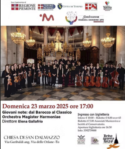TORINO – Gli ottimi risultati qualitativi di quindici anni di affiatamento, concerti e studio degli allievi dell’Orchestra Magister Harmoniae – diretti da Elena Gallafrio – potranno essere apprezzati domenica 23 marzo alle 17 nell’antica chiesa di San Dalmazzo (via delle Orfane 3 – angolo via Garibaldi) in un concerto – nell’ambito di Torino Chamber Music Festival – ricco di musicalità e sonorità di Bach, Mozart e Vivaldi