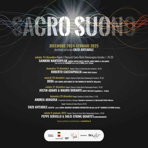 Promossa e finanziata dal Comune di Napoli nell’ambito del progetto Napoli Città della Musica e organizzata da Andrea e Mario Aragosa per Black Art – Ets, Sacro Suono presenta 6 concerti a ingresso gratuito con grandi artisti italiani e internazionali.