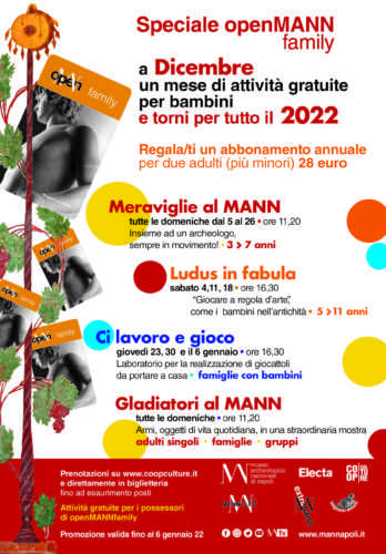 Il Museo si prepara alle festività natalizie con una variegata proposta culturale per cittadini e turisti: dal 6 dicembre ripartirà la campagna di abbonamento all’Istituto. Il claim scelto è “Vieni al MANN a dicembre e torna per tutto il 2022”.  Da lunedì prossimo, in biglietteria e on-line, sarà possibile acquistare la card annuale a prezzi promo: 16 euro per un adulto, 28 euro per due over 25 anni (opzione family), 3 euro per ragazzi dai 18 ai 24 anni e per tutti gli studenti universitari, senza limiti di età. L’abbonamento OpenMann ha la validità di 365 giorni dalla data di attivazione e consente accessi illimitati al Museo, per visitare mostre temporanee e collezioni permanenti. Dal 4 dicembre al 6 gennaio, chi sottoscriverà una card family potrà partecipare gratuitamente, sino ad esaurimento posti, ai laboratori didattici per bambini proposti da Coopculture. Inoltre, l’abbonamento garantisce di visitare con il 25% di sconto gli oltre trenta siti culturali della rete Extramann, ricevendo una newsletter mensile con le offerte dedicate. Tra le strenne natalizie prodotte dal Museo anche il volume a fumetti  “Nico e l’elmo del Gladiatore” (Electa) e il calendario della Scuola Italiana di Comix.