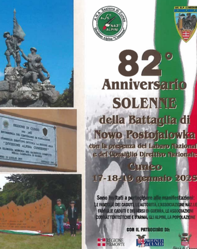 Nel fine settimana sono previsti in città una serie di eventi (in allegato il programma completo n.d.r.) per commemorare l’82° anniversario della battaglia di Nowo Postojalowka, in ricordo del sacrificio degli Alpini della Cuneense avvenuto in Russia nel gennaio del ’43. La Divisione venne praticamente annientata, con il doloroso primato di quasi 14mila tra morti e dispersi sui 15mila partiti l’anno precedente dalla stazione di Cuneo.