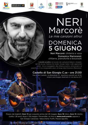 Non solo musica però: al concerto verrà abbinato un recital in cui Neri Marcorè tratterà il tema della reciprocità. Prima di diventare attore e conduttore, Marcorè ha mosso i primi passi nel mondo dell’arte attraverso la musica, una passione mai sopita che negli ultimi anni ha ripreso linfa e corpo. Produzioni teatrali come “Un certo signor G”, “Beatles Submarine” e “Quello che non ho” e una serie di concerti lo hanno portato a frequentare con assiduità il repertorio di Fabrizio De André, Giorgio Gaber, Gianmaria Testa e altri cantautori. I biglietti per assistere allo spettacolo costano 13 euro per l’acquisto prima di sabato 28 maggio e 18 euro da domenica 29; il biglietto ridotto per gli spettatori sotto i 26 anni cosa 15 euro a partire dal 29. Le prevendite online sono sul sito www.oooh.events, mentre a San Giorio i biglietti si possono acquistare alla tabaccheria Truffo di piazza Ippolito.
