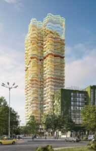L’edificio è organizzato in tre blocchi: la parte commerciale alla base, gli appartamenti nella fascia intermedia, l’albergo che sarà allocato nella parte panoramica dominante. La componente di verde urbano sarà mantenuta e anzi aggiunta all’intera area.