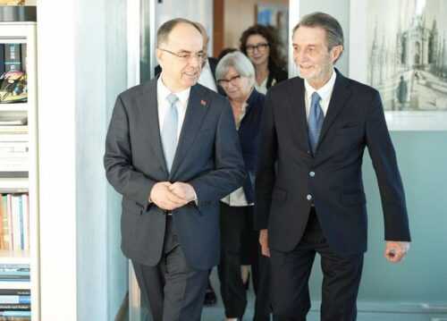 Il Presidente della Giunta regionale lombarda ha ricevuto il Capo dello Stato del Paese delle Aquile, nel contesto del ricevimento delle Autorità estere accreditate ai giochi olimpici di Milano/Cortina. Il vertice fra i due massimi rappresentanti istituzionali si è svolto nella sede del grattacielo di Palazzo Lombardia nel capoluogo meneghino. L’onorevole Attilio Fontana si era in precedenza recato in visita in territorio albanese nella capitale Tirana nel gennaio 2024